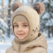 Kominiarka zimowa z dwoma pomponami dla dziewczynki, Gizelda, beżowa, 49-53 cm