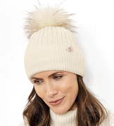 Beret damski zimowy, pompon jenot, Castelia, wełniany, beżowy, 55-57 cm