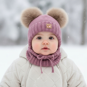 Czapka z dwoma pompoanmi i komin dla dziewczynki na zimę, Merlina, beżowy, 47-50 cm