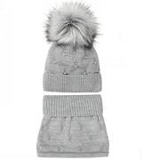 Komplet czapka i chusta dla dziewczynki, z pomponem, Fanny, szary + róż, 52-55 cm