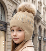 Kominiarka zimowa z dwoma pomponami dla dziewczynki, Gizelda, beżowa, 49-53 cm