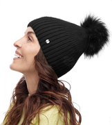 Beret damski zimowy, pompon jenot, Castelia, wełniany, czarny, 55-57 cm