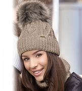 Elegancka czapka damska zimowa, wełniana z pomponem z jenota, Jenova, beżowa, 55-59 cm