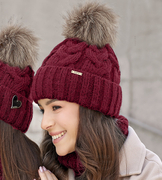 Elegancka czapka damska zimowa, wełniana z pomponem z jenota, Jenova, bordowa, 55-59 cm