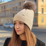 Czapka z futerkowym pomponem dla dziewczynki, Koralia, beżowa, 53-56 cm