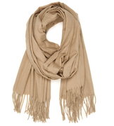 Szalik damski beżowy cienki z frędzlami – miękki, poliestrowy, na jesień i zimę