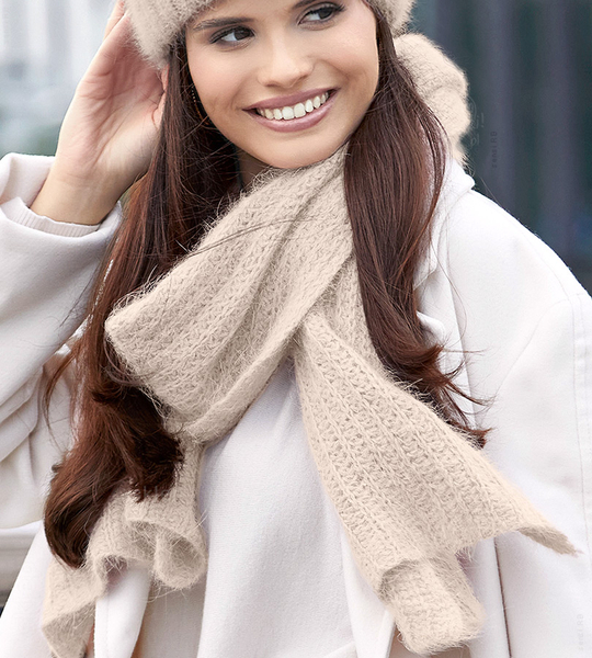 - Ciepły szalik damski, uszyty z wełny angory (50%).