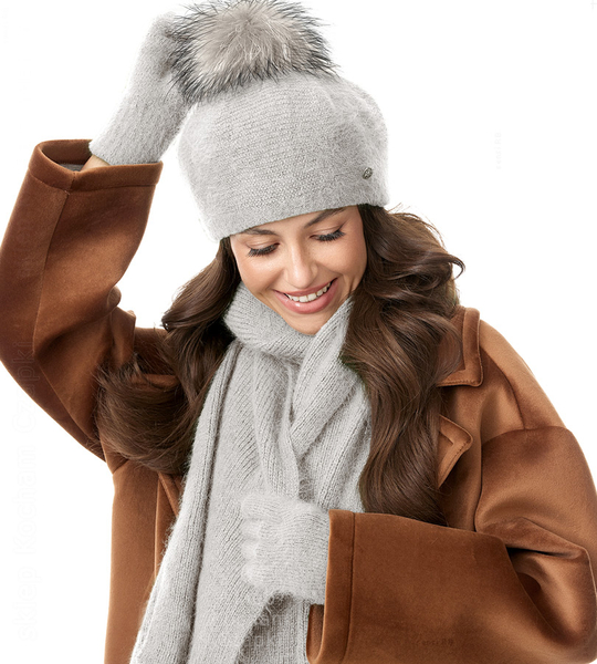 - Damski zestaw zimowy: beret z pomponem z futerka w komplecie z szalikiem i rękawiczkami. Uszyty z dzianiny z angory z dodatkiem poliamidu. Ekskluzywny zestaw.
