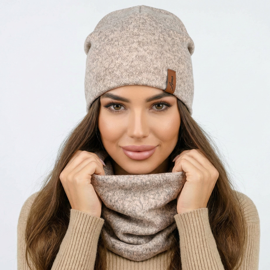 Czapka smerfetka i komin damski, komplet wiosenny/jesienny, na łagodną zimę, beżowy melanż, 55-57 cm