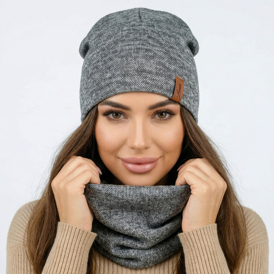Czapka smerfetka i komin damski, komplet wiosenny/jesienny, na łagodną zimę, szary melanż, 55-57 cm