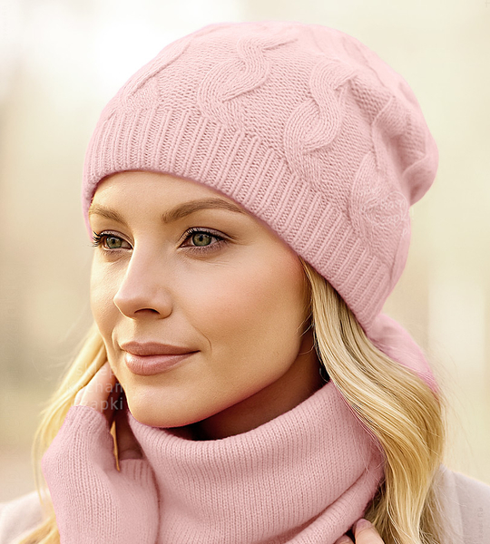 Komplet czapka i komin damski z wełny merino i kaszmiru, Likana, pudrowy róż, 55-58 cm