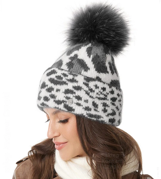 - Damska czapka premium z angory ze wzorem panterki i pomponem z naturalnego jenota. Miękka, ciepła i puszysta dzięki długiemu włosowi angory. Gwarantuje wygodę i ekskluzywny wygląd.