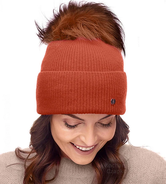 Czapka Damska z Wełny Merino i Kaszmiru z Pomponem z Jenota, Cavilla, pomarańczowa, 55-57 cm