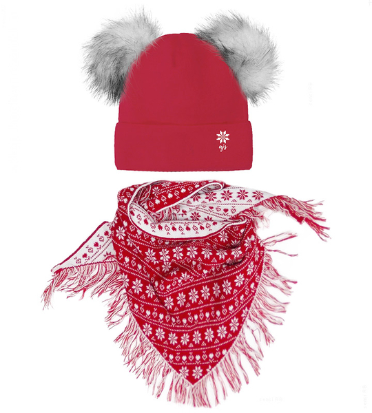 - Czapka z pomponami z futerka i dwustronna ciepła chusta z włóczki. Ten komplet dedykowany jest na zimę dla dziewczynek, które lubią wyglądać wyjątkowo ładnie.