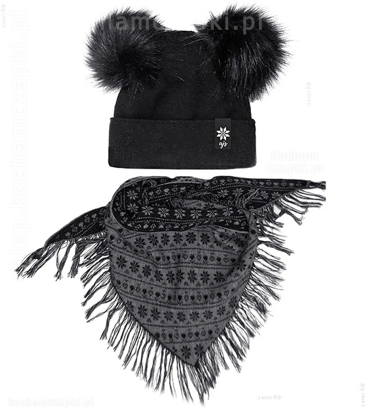 - Czapka z pomponami z futerka i dwustronna ciepła chusta z włóczki. Ten komplet dedykowany jest na zimę dla dziewczynek, które lubią wyglądać wyjątkowo ładnie.