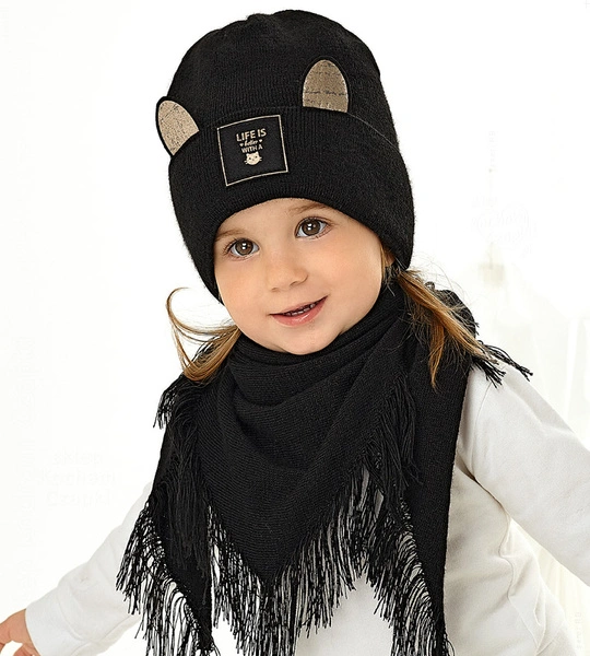- Zimowa czapka i chusta z włóczki dla dziewczynki. Ciepła i miła w dotyku. Czapka beanie z podwiniętym brzegiem, z którego wystają pozłacane/przetarte uszka kotka. Na naszywce motyw z kotkiem.