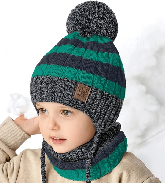 - Czapka z kominem dla chłopca. Czapka wiązana, zasłania uszy, uszyty z dwóch warstw dzianiny. Miękki i przyjemny materiał.