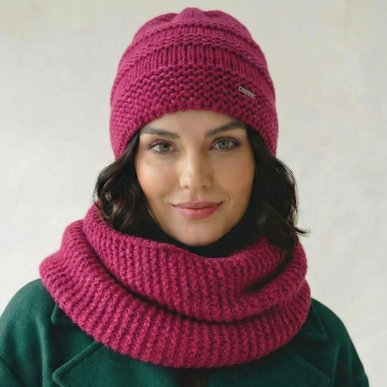 Czapka i komin do obwijania, zimowy damski komplet, Irydia, amarantowy, 56-60 cm