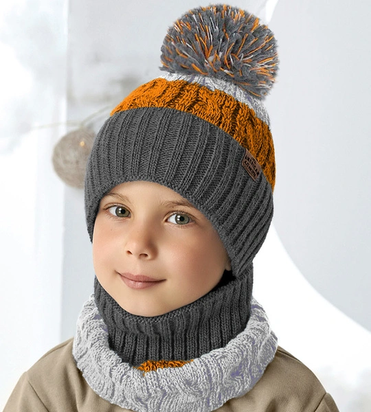 Czapka i komin, komplet na zimę dla chłopca, Acquaro, szary + pomarańcz, 49-52 cm