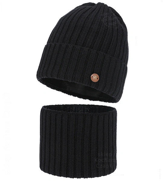 - Komplet czapka i komin z 100% wełny merino o szerokim prążku. Czapka z podwiniętym brzegiem i bawełnianą podszewką. Merino zapewnia ciepło, oddychalność, regulację temperatury i odprowadzanie wilgoci. Idealny na zimę.