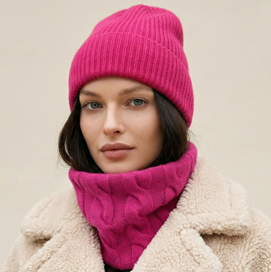 Czapka i komin z wełny merino i kaszmiru, komplet damski, różowy, 55-58 cm