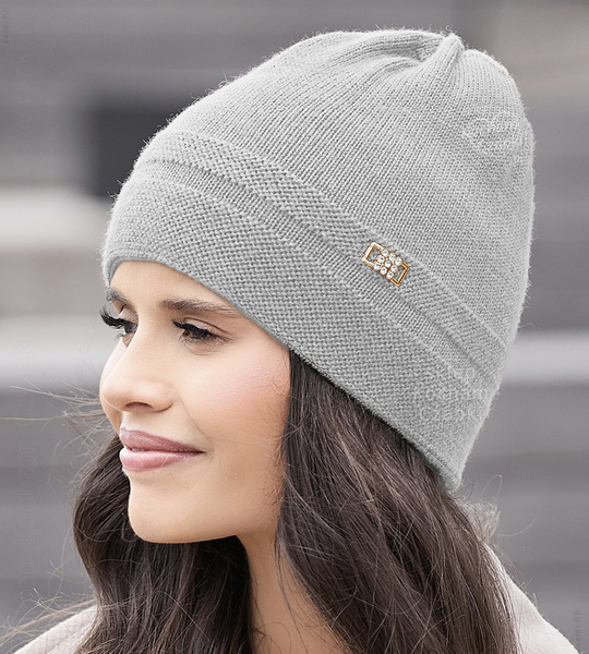 Czapka zimowa damska, elegancka, z wełny 100% merino, Orchidea, szary, 55-57 cm