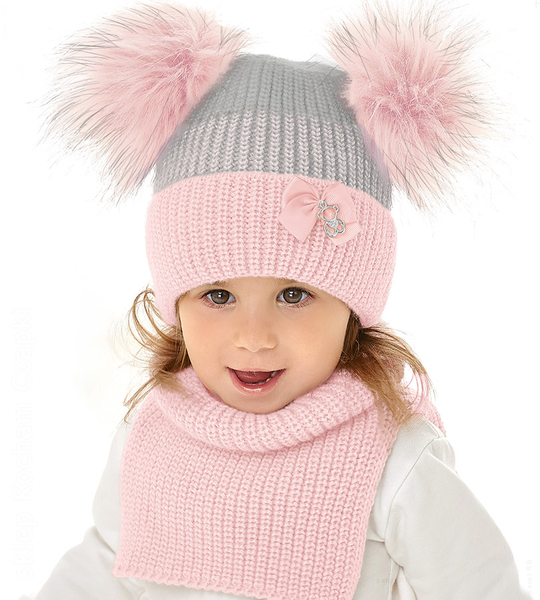 Czapka zimowa i golf, dwa pompony, róż jasny + szary, Apolonia, 50-54 cm