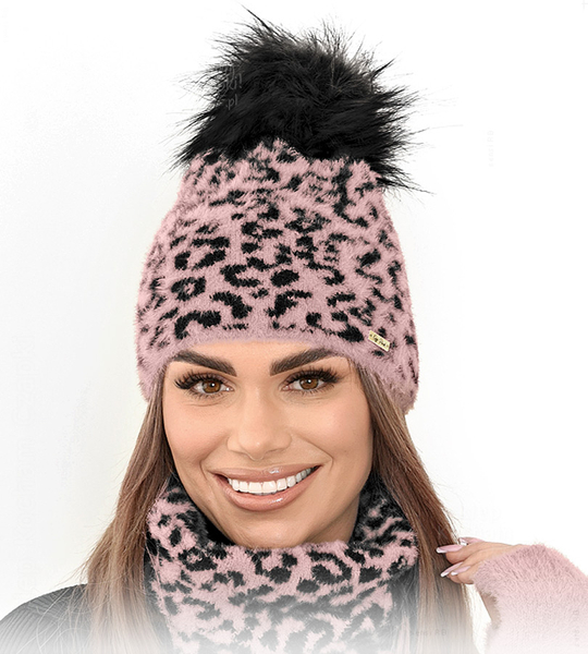Czapka zimowa z pomponem, damska, panterka Paraiso, alpaka, różowy, 55-58 cm