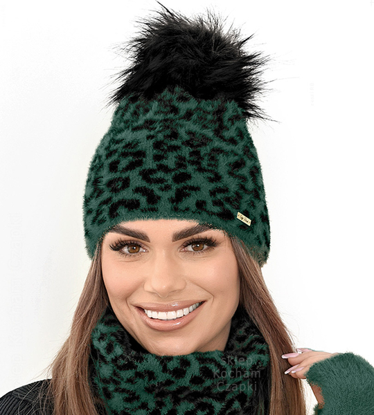 Czapka zimowa z pomponem, damska, panterka Paraiso, alpaka, zielony, 55-58 cm