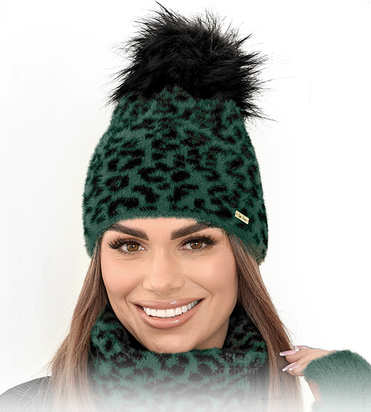 Czapka zimowa z pomponem, damska, panterka Paraiso, alpaka, zielony, 55-58 cm