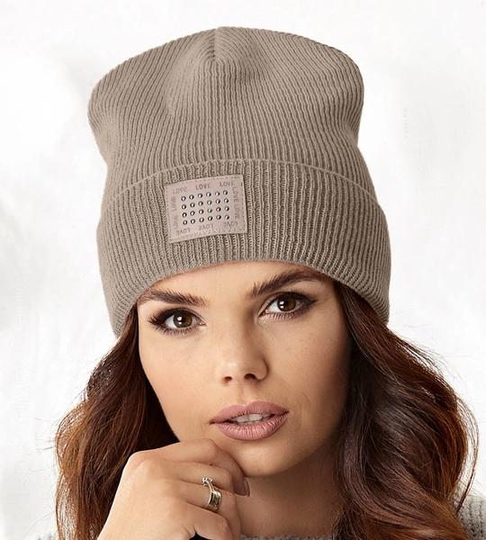 - Ciepła czapka damska z podwójnej warstwy dzianiny. Idealna na zimę i okresy przejściowe. Prążkowana, bardzo elastyczna, w dużym rozmiarze – wygodna także dla pań o większym obwodzie głowy. Ozodobona naszywką ze skórki z dżetami.