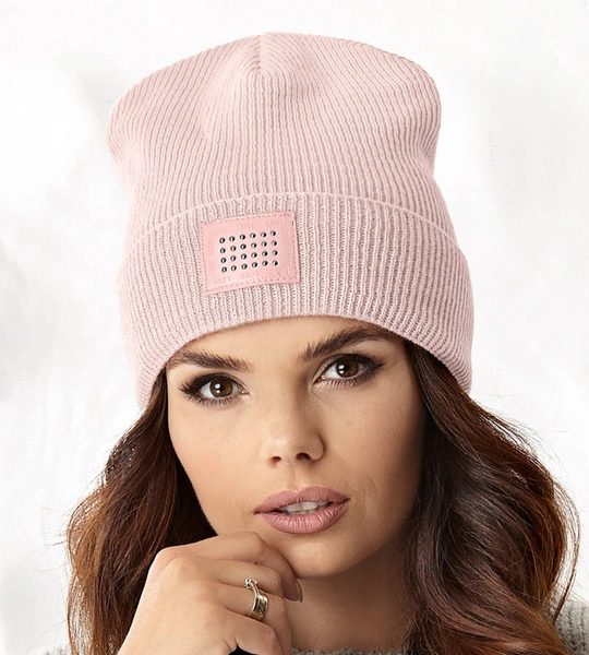 - Ciepła czapka damska z podwójnej warstwy dzianiny. Idealna na zimę i okresy przejściowe. Prążkowana, bardzo elastyczna, w dużym rozmiarze – wygodna także dla pań o większym obwodzie głowy. Ozodobona naszywką ze skórki z dżetami.