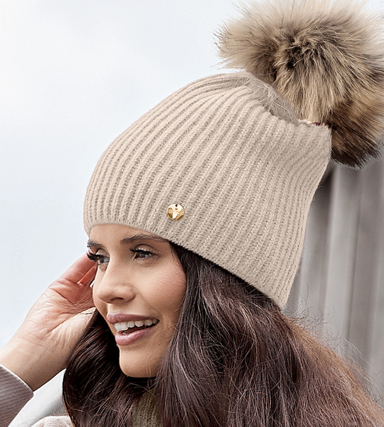 - Ekskluzywna czapka wełniana premium o prążkowanej strukturze. Gruba, ciepła i miękka w dotyku. Zdobiona naturalnym pomponem z futra jenota i złotą blaszką. Luksusowy dodatek dla kobiet ceniących jakość i elegancję.
