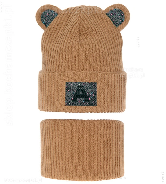 - Charakterystyka czapki: dzianina prążkowana, bawełniana podszewka, sterczące uszka wykończone materiałem, nawiązującym do wzorów zwierzęcych, naszywka z tego samego materiału z dżetami w literce A.