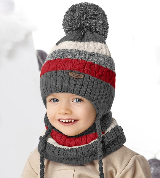 - Fajny komplet chłopięcy, zimowy: wiązana czapka z pomponem i ciepły komin- golf na szyję.