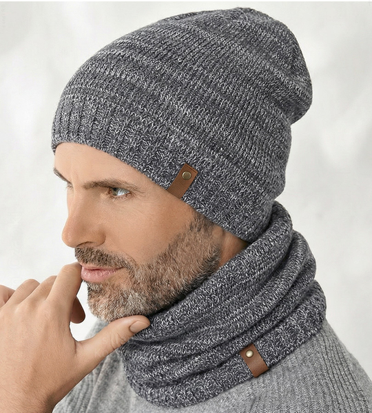 Czapka i komin dedykowany dla mężczyzn na jesień i łagodną zimę. Czapka nie ma podszewki,