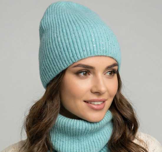 Modna czapka z cyrkoniami i komin w prążek, Xo, turkusowy, 56-58 cm