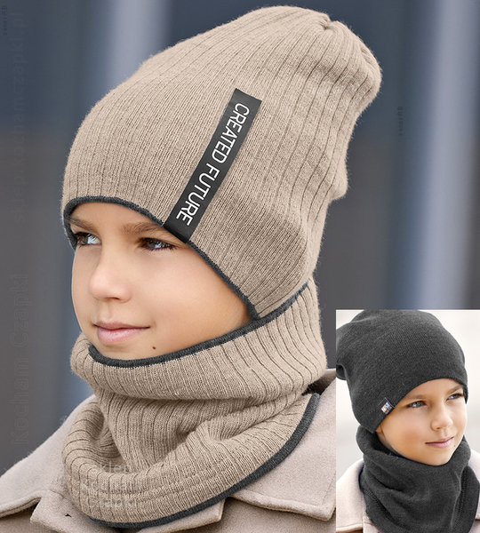 Zimowa czapka i komin, sportowy komplet dla chłopca, Creation, dwustronny, beżowy + grafit, 50-55 cm