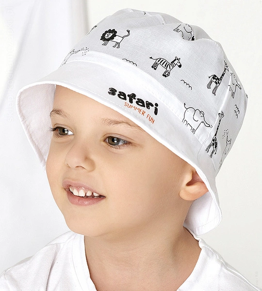 - kapelusz bawełniany dla chłopca ozdobiony wzorem przedstawiającym zwierzęta safari. Na rondzie umieszczony jest napis "safari". Idealny dodatek do letnich przygód!