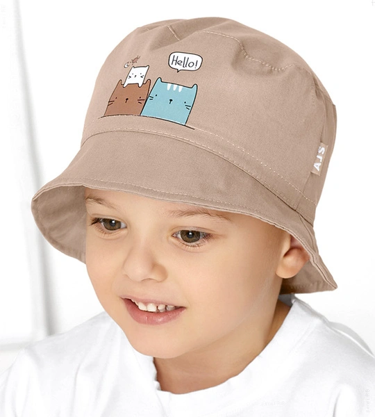 - Chłopięcy kapelusz, idealny na letnie dni! Wykonany z delikatnej, płóciennej bawełny, zapewniającej ochronę przed słońcem i przeciwdziałającą przegrzaniu. Z tyłu kapelusza gumka. Ozdobiony jest uroczym nadrukiem z obrazkiem rodziny kotków.