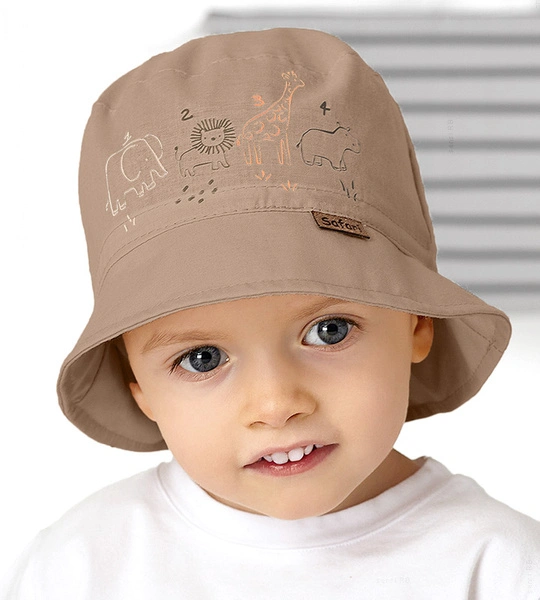 - Kapelusz bawełniany dla chłopca, ozdobiony wzorem przedstawiającym zwierzęta safari. Idealny dodatek do letnich przygód! Z tyłu kapelusza wszyta gumka.