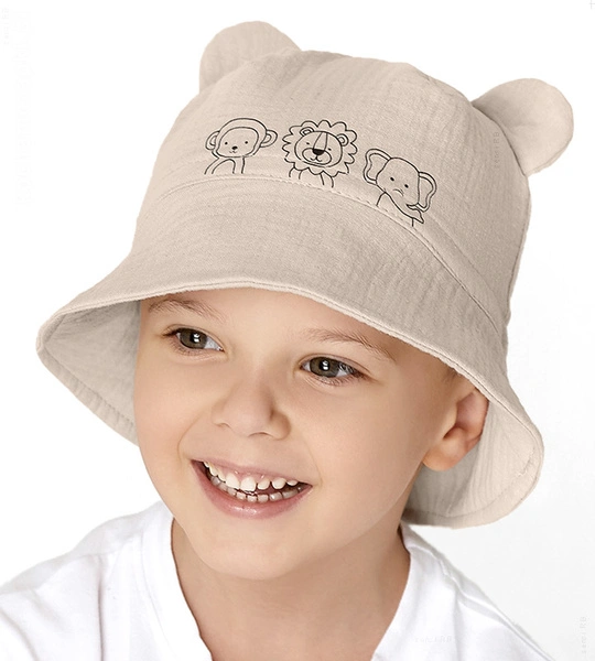 - Lekki kapelusz z muślinu! Wygodny i stylowy, idealny na gorące dni. Z przodu ozdobiony uroczym nadrukiem przedstawiającym słonia, lwa i małpę, który doda uroku każdej letniej stylizacji.