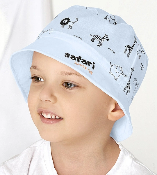 - kapelusz bawełniany dla chłopca ozdobiony wzorem przedstawiającym zwierzęta safari. Na rondzie umieszczony jest napis "safari". Idealny dodatek do letnich przygód!