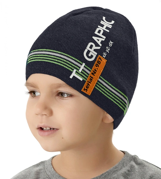 - Klasyczna czapka dla chłopca o dopasowanym kroju. Dzianina jest miękka i elastyczna. Czapka na jesień / wiosnę. Wykończona naszywką i napisami.
