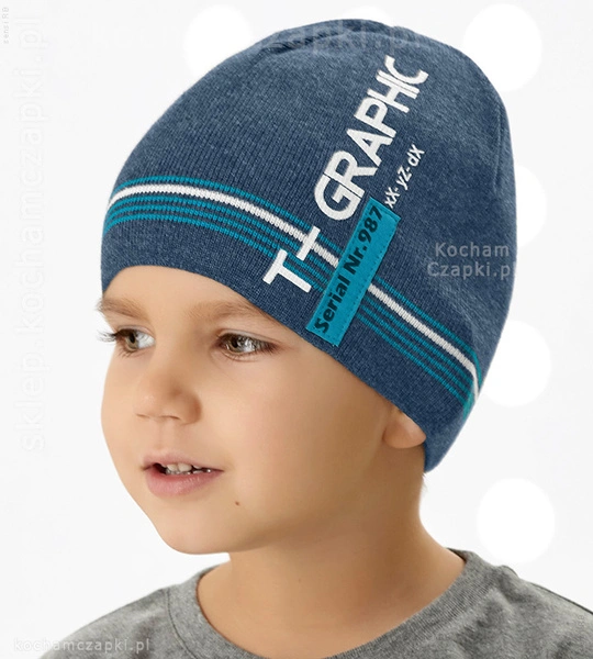 - Klasyczna czapka dla chłopca o dopasowanym kroju. Dzianina jest miękka i elastyczna. Czapka na jesień / wiosnę. Wykończona naszywką i napisami.