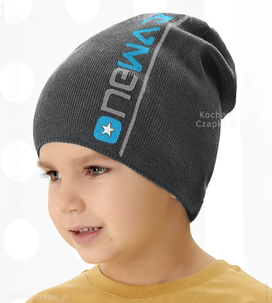 - Modna szara czapka dla chłopca uszyta z dzianiny. Z napisem NewAge