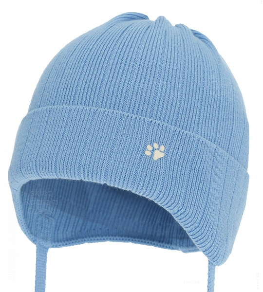 Model posiada podwijany dół, który dobrze chroni uszy przed chłodem i wiatrem. Sznurki do wiązania zapobiegają zsuwaniu się czapki, dzięki czemu idealnie sprawdza się podczas spacerów. Subtelna, mała odbita łapka nadaje czapce uroczego, chłopięcego charakteru.