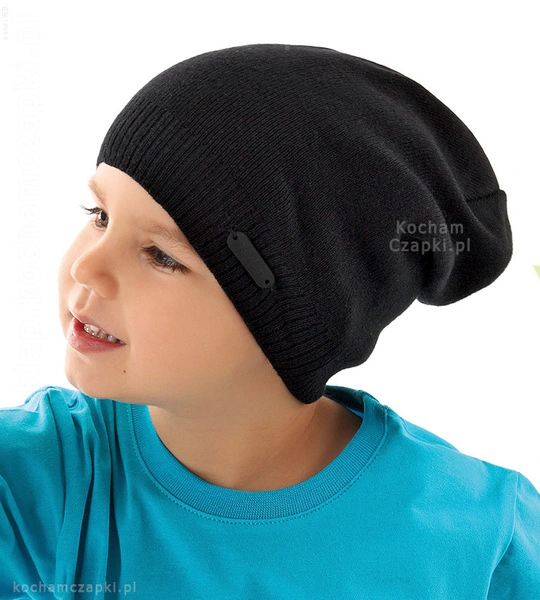 - Czapka typu smerf dla chłopca. Uszyta z cienkiej dzianinki w kolorze czarnym. Jest miękka i elastyczna.