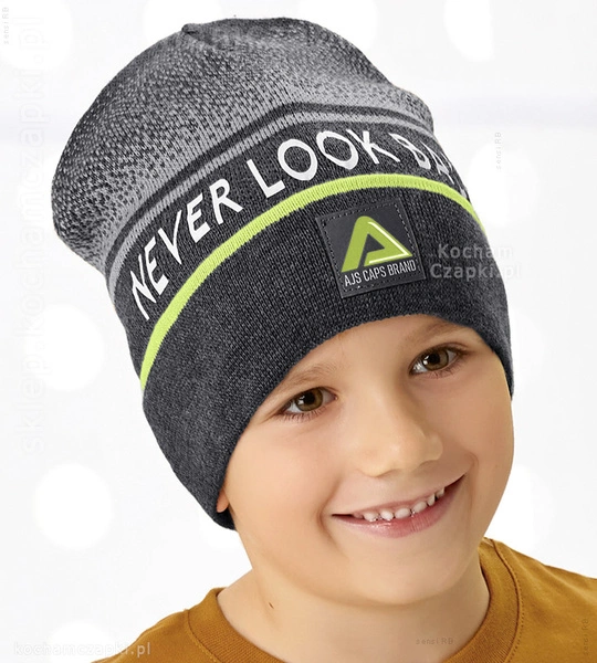 - Dzianinowa czapka chłopięca o modnym kroju czapki beanie.