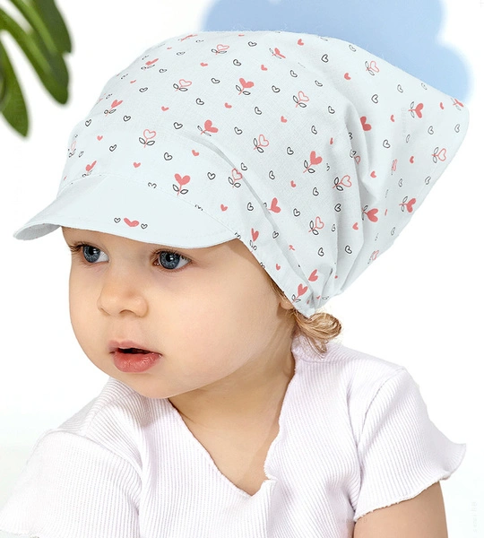 - Chustka na głowę dziewczynki z daszkiem. Chustka utrzymuje się na głowię dzięki gumce - wszytej z tyłu. Chustka jest doskonałym nakryciem głowy na lato. Chroni głowę przed słońcem, jednocześnie jest lekka i przewiewna.